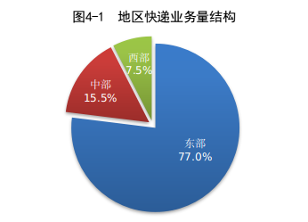 1-8月,東、中、西部地區快遞業務量比重分別為77.0%、15.5%和7.5%,業務收入比重分別為77.4%、13.4%和9.2%。與去年同期相比,東部地區快遞業務量比重下降1.5個百分點,快遞業務收入比重下降1.0個百分點;中部地區快遞業務量比重上升1.3個百分點,快遞業務收入比重上升0.7個百分點;西部地區快遞業務量比重上升0.2個百分點,快遞業務收入比重上升0.3個百分點。