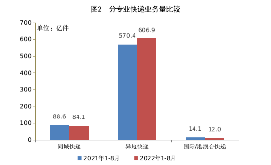 1-8月,同城、異地、國際/港澳臺快遞業務量分別占全部快遞業務量的12.0%、86.3%和1.7%;業務收入分別占全部快遞業務收入的6.6%、49.2%和10.8%。與去年同期相比,同城快遞業務量的比重下降1.2個百分點,異地快遞業務量的比重上升1.6個百分點,國際/港澳臺快遞業務量的比重下降0.4個百分點。